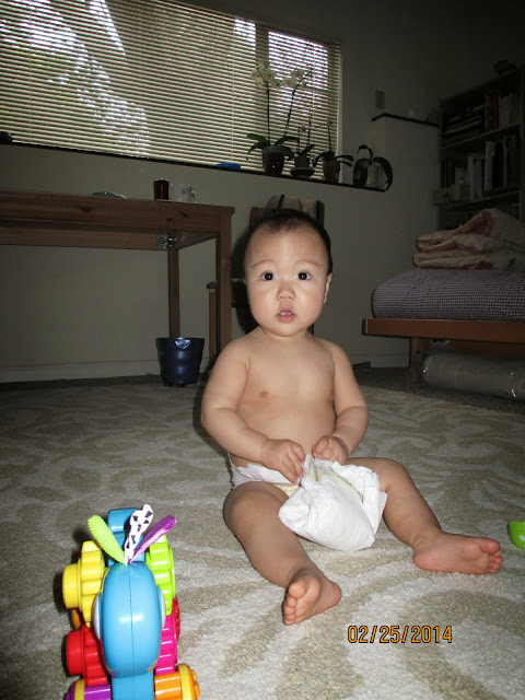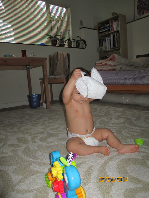 Babies are easily fascinated. Today Iris was playing with her diaper (a clean one!). She kept on trying to put it on her head like a hat. Silly baby.