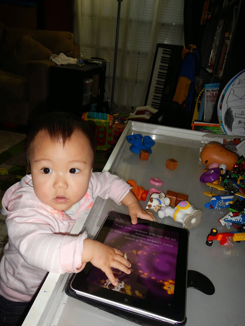 I introduced Iris to this baby rattle game on the iPad. At first she just watched it then she started banging on the iPad. Basically, this object will bounce around the screen and make silly noises each time you touch the screen or touch the object. It’s a bit loud and I can see how it can be scary but she found it interesting but only for a short time. She rather play with physical objects.